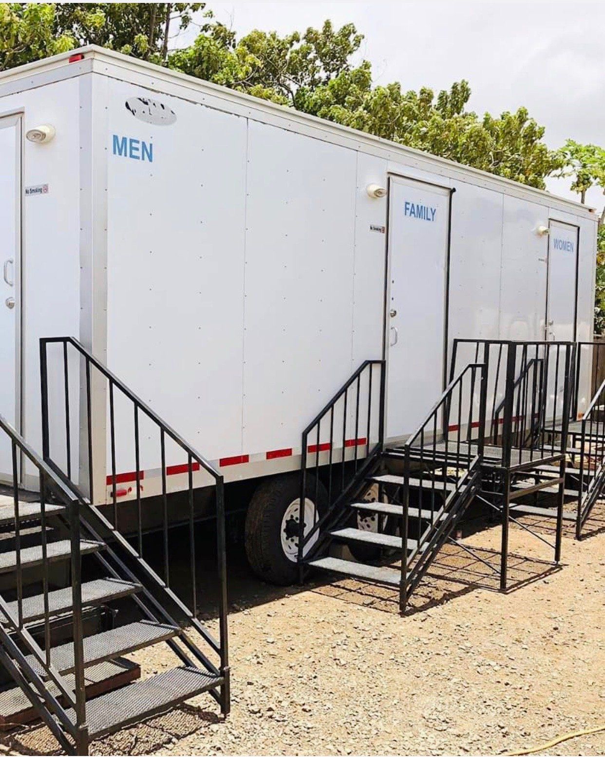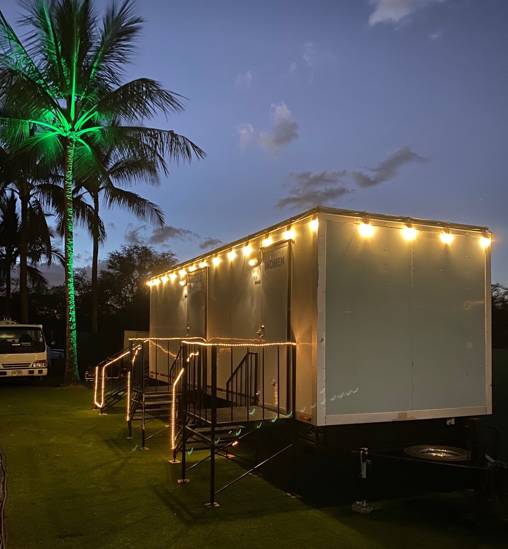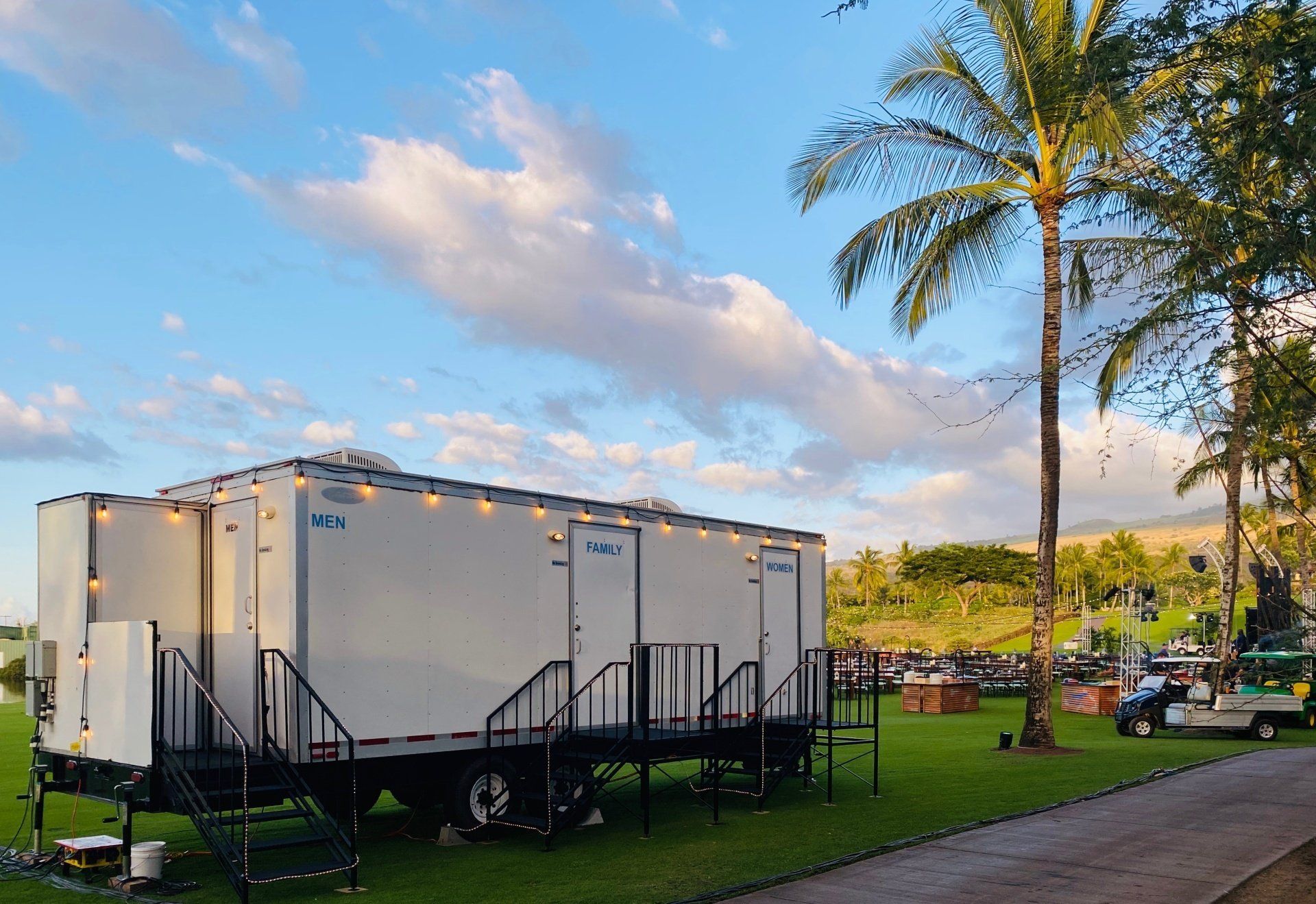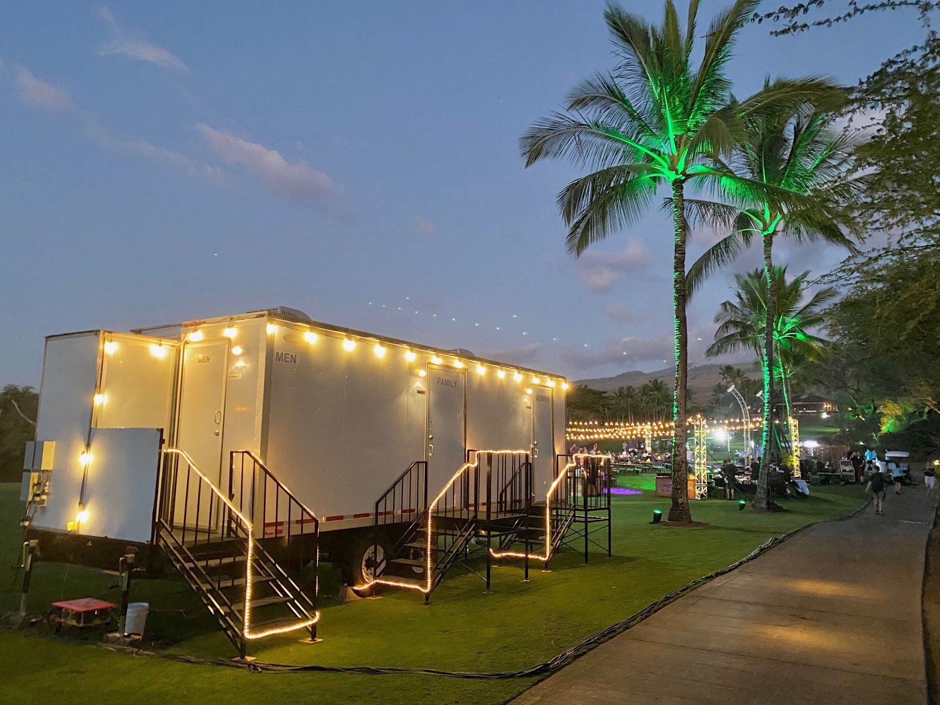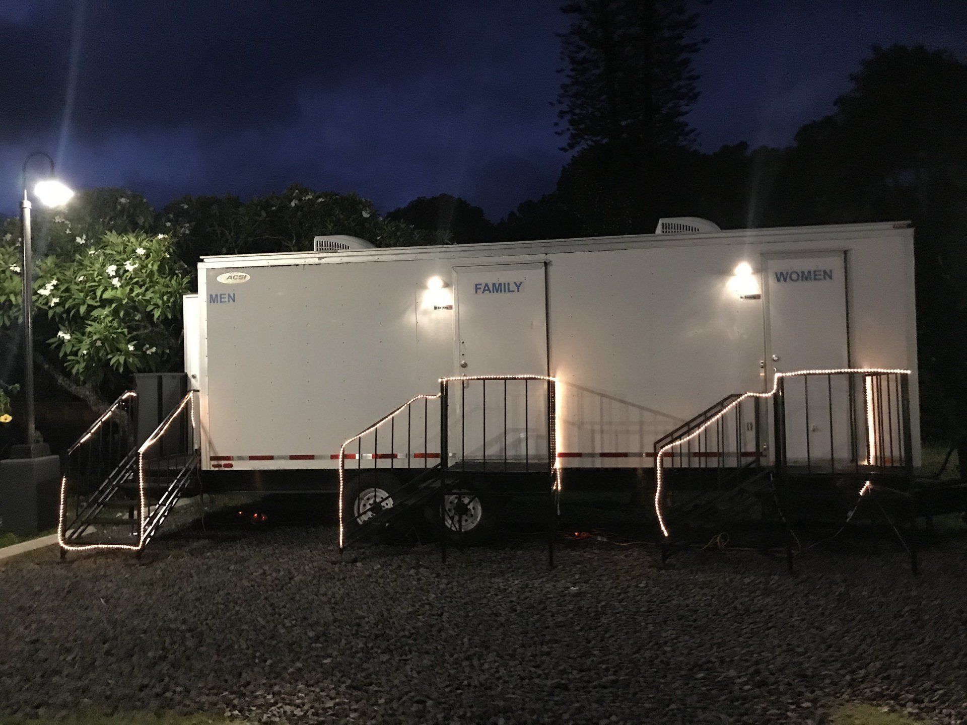 We now offer two Luxury portable restroom trailers. Impress your guest at any event. Men's, Women's, and family room suites play an ambiance of select Hawaiian music as the air conditioning keeps the environment at a controlled temperature.